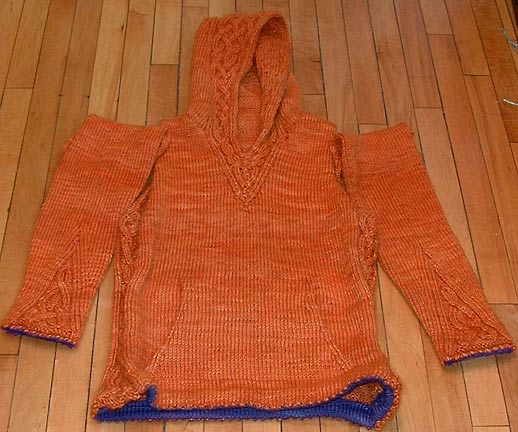 Pattern by Jenna Wilson. Much easier than I expected since it is labeled "Advanced Cables." Knitted with Kokopelli yarn from Fiesta Yarns in the color Squash Blossom (K14) - got it when KnitPicks blew out all their yarn from other vendors - it was less than wholesale, not to mention a great color. Did the hems with purple Koigu Kersti for contrast and because the Kokopelli is soooo thick. Now, if I would just sew in the sleeves and block it...I'm going to felt it a bit and use it for my winter coat next year :-)