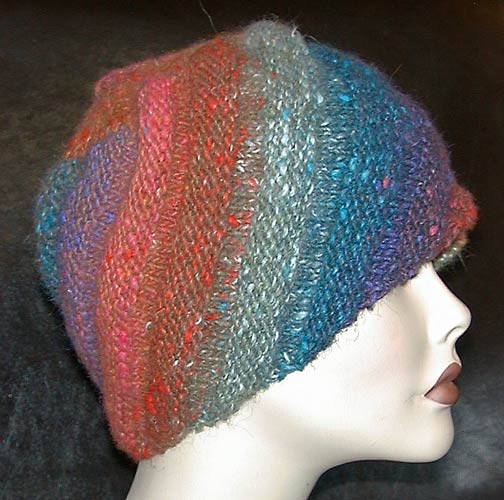 Ann Norling's Swirl Hat pattern done without the lower ribbing - get the pattern at your local yarn store. I did it in Silver Thaw by Noro with enough left over to make another smaller cap thusly: